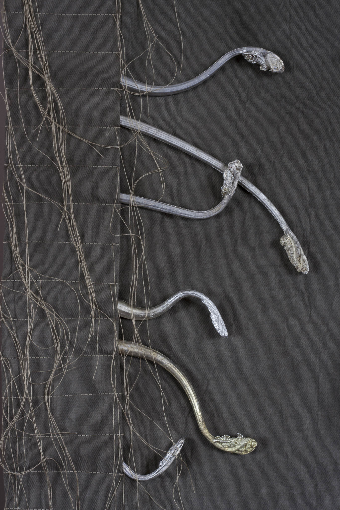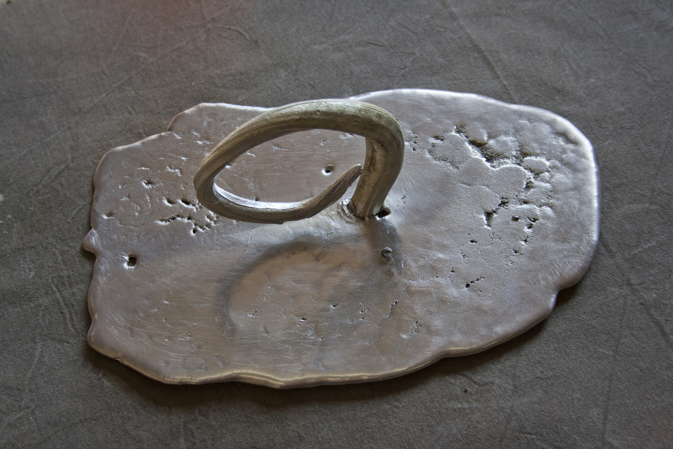 Medium: cast pewter, dyed waxed canvas, thread, iron hoop