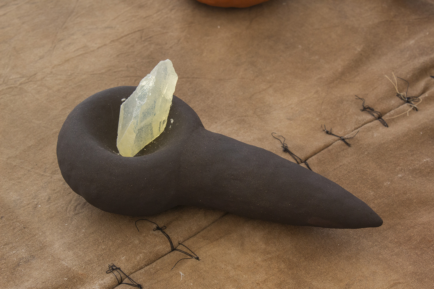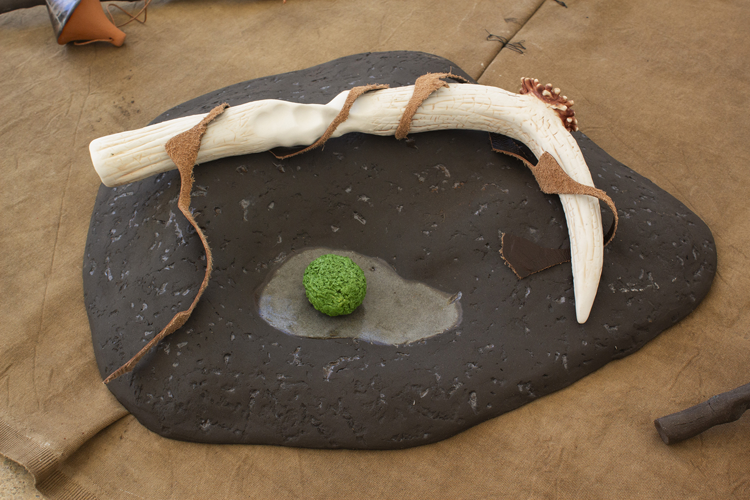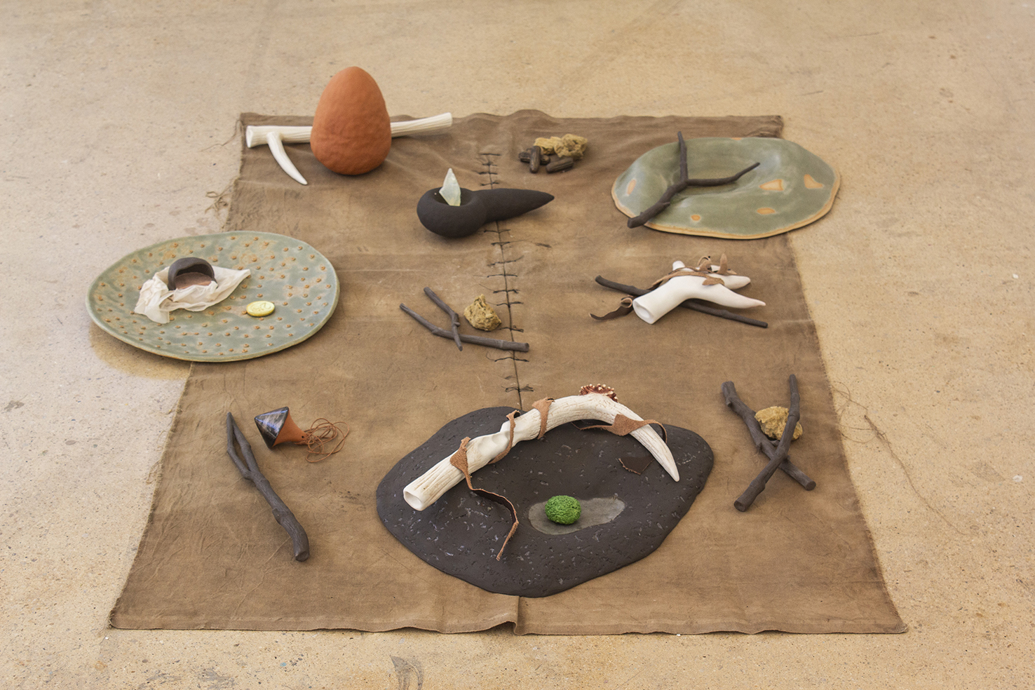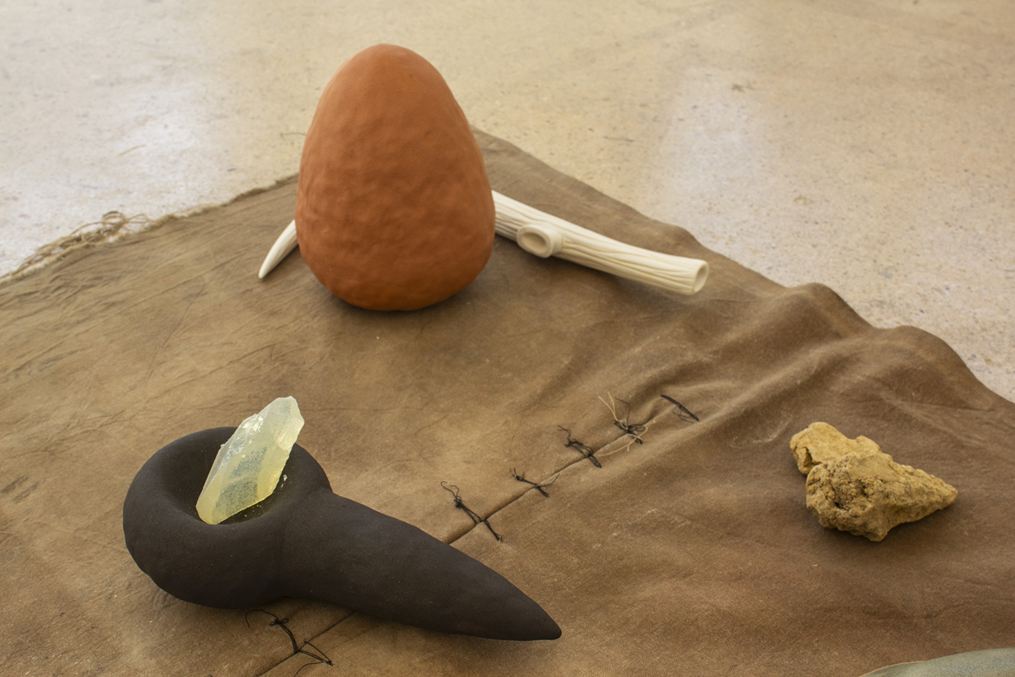 Earthscape Cosmography is an evolving assemblage of objects and reconstructed relics imprinted with the maker's hand. These are dwelling materials suggesting activities of foraging and sheltering reaching across human timescales, referencing ancient mining tools used for 'scratching the earth', as well as hearth-making materials, tools and play.