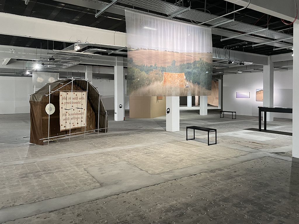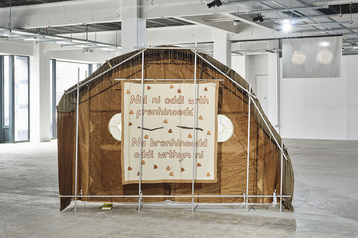 Medium: dyed waxed canvas, aluminium tubing, metal fixings, hand-stitched wool blanket, printed textile banner, ceramic details, pewter cast bracken fronds
