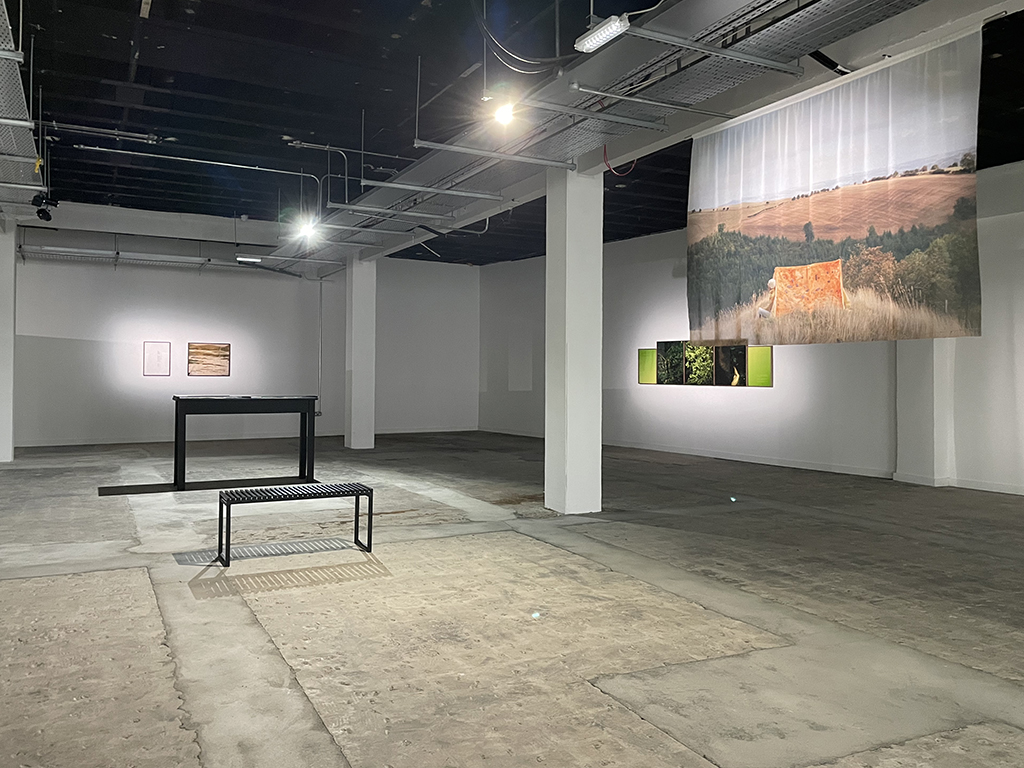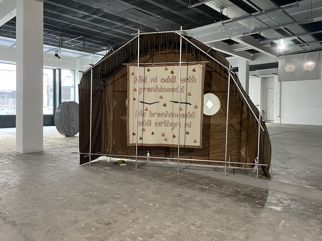 ‘A Field Guide to the Offa’s Dyke’, explores the psychogeography of the dyke in present time, and imagines the Welsh borderlands and dual identity as a space of creative potential. The ancient border earthwork is manifested as a sculptural construction based on a cross-section of the dyke. Its looming and irregular form when viewed on approach from one side gives way to an open space on the other. The stitched wool blanket hanging underneath reinvents a slogan from the 1600s painted on a farmhouse inhabited by members of my family. The new version of the slogan reads ‘Nid ni oddi wrth frenhinoedd, na brenhinoedd oddi wrthym ni’ (‘Not We From Kings, Nor Kings From Us.’). Opposite the shelter/cross-section piece hangs a gauzy, semi-transparent textile banner depicting a handmade tent pitched astride the Offa’s dyke at Edenhope hill.