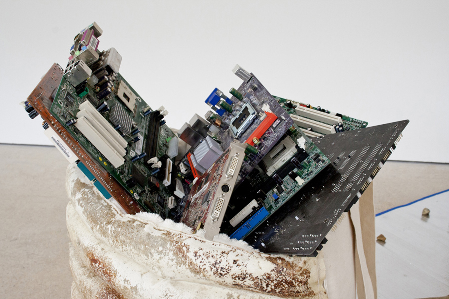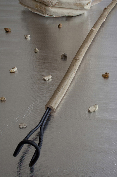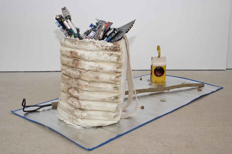 Hughes’ work for the exhibition 'Indendiary' reimagined the 'Ragpicker', a figure associated with 19th century western cities who collected rags and bones so they could be transformed in to paper and glue. The Ragpickers of Paris sorted the city’s detritus by hand, sifting through the ‘motley vomit of enormous Paris’, as Baudelaire described it. Today’s ragpickers, concentrated in the developing world, sort through toxic materials including the innards of computers. The props presented here explore how the identity of the ragpicker could be reinvented in the west.