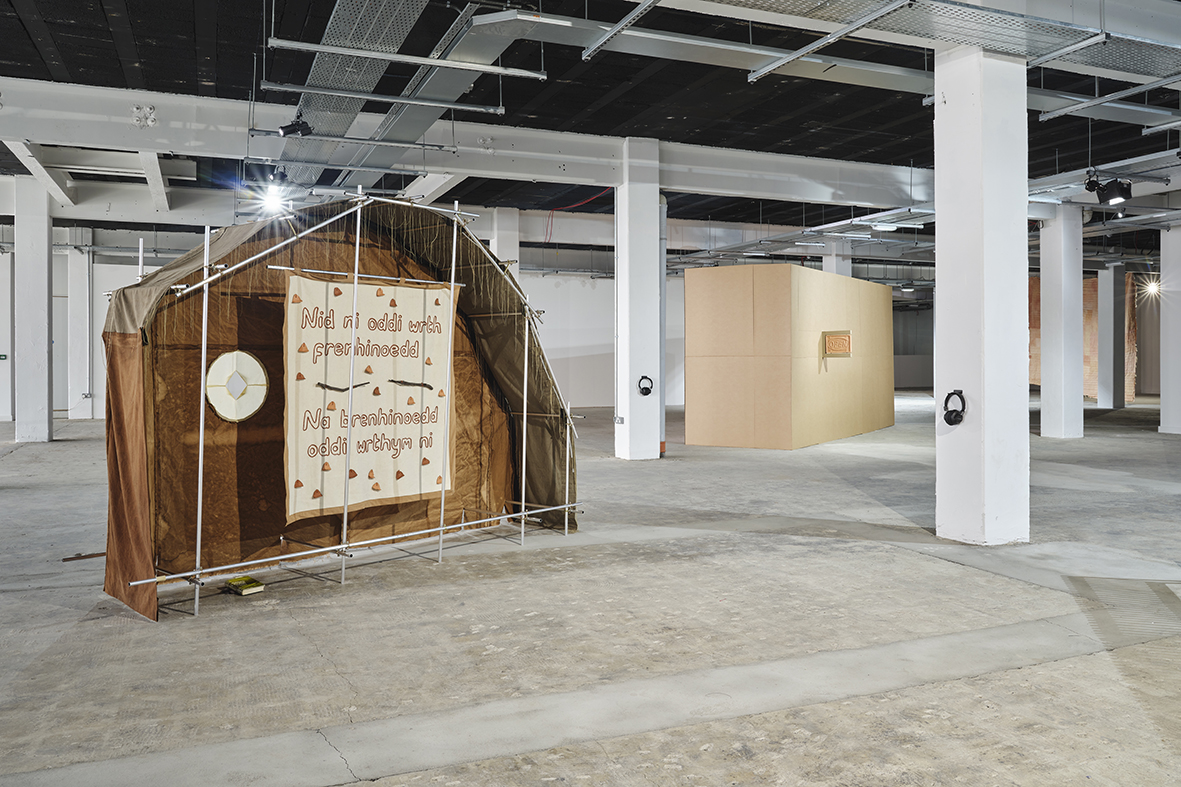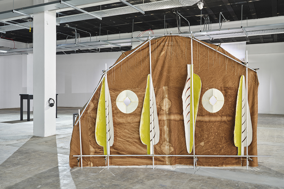 Medium: dyed waxed canvas, aluminium tubing, metal fixings, hand-stitched wool blanket, printed textile banner, ceramic details, pewter cast bracken fronds
